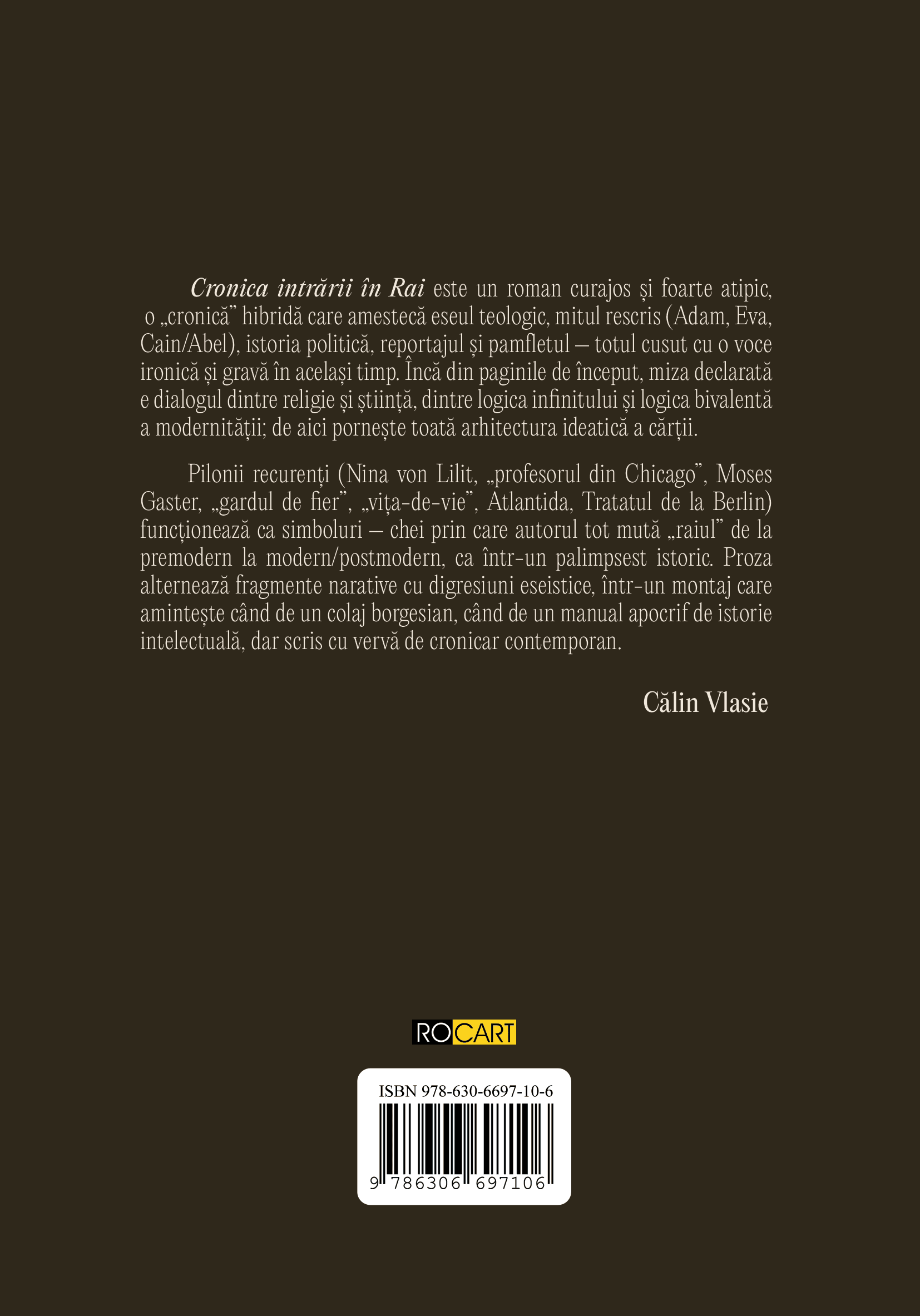 Cronica intrării în Rai este un roman curajos și foarte atipic, o „cronică” hibridă care amestecă eseul teologic, mitul rescris (Adam, Eva, Cain/Abel), istoria politică, reportajul și pamfletul – totul cusut cu o voce ironică și gravă în același timp. Încă din paginile de început, miza declarată e dialogul dintre religie și știință, dintre logica infinitului și logica bivalentă a modernității; de aici pornește toată arhitectura ideatică a cărții.